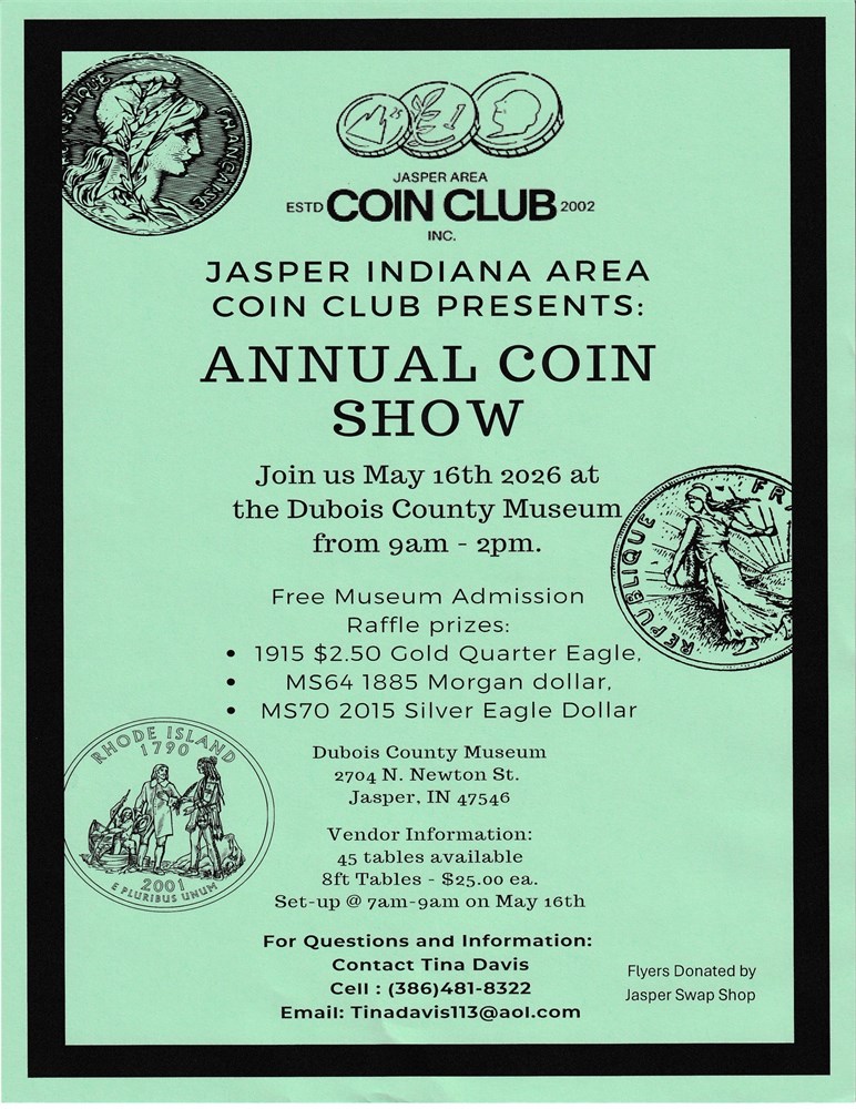 Doors open to dealers at 7am. Show is from 9 to 2. Dealers can not break down tables before 1:30pm. Tables are 8ft. $25each. Make checks payable to Jasper Area Coin Club and mail to Tina Davis 924 Carter Rd. Owensboro ky 42301. Call Tina at 3864818322 with any questions