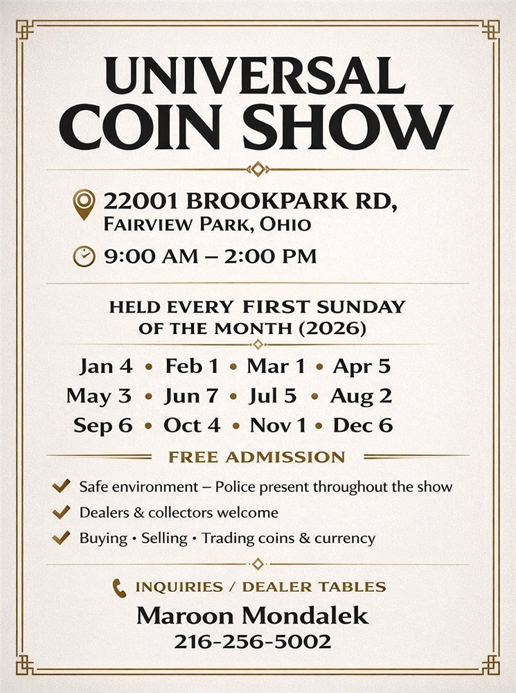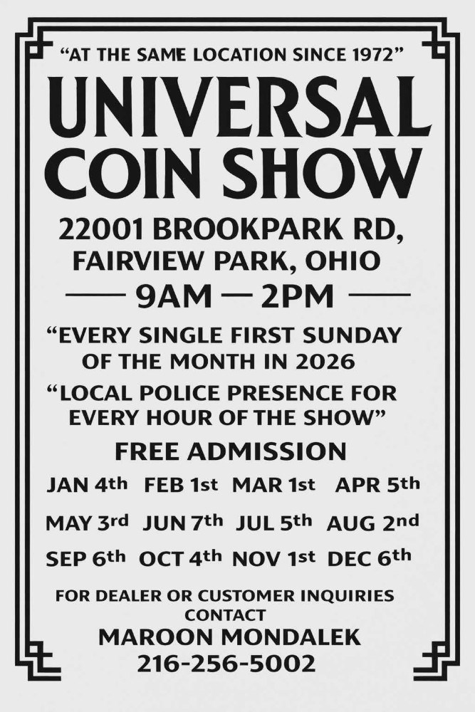 CARAT COIN proudly presents the Cleveland Universal Coin Show - First Sunday of every month!