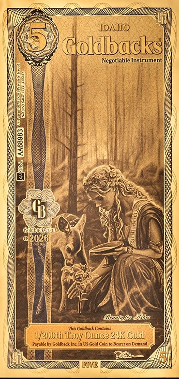 Idaho 5 Goldbacks 2026 Alpha Gold Note 1/200th Troy Oz 24KT Goldback Gem Unc View Watchlist >