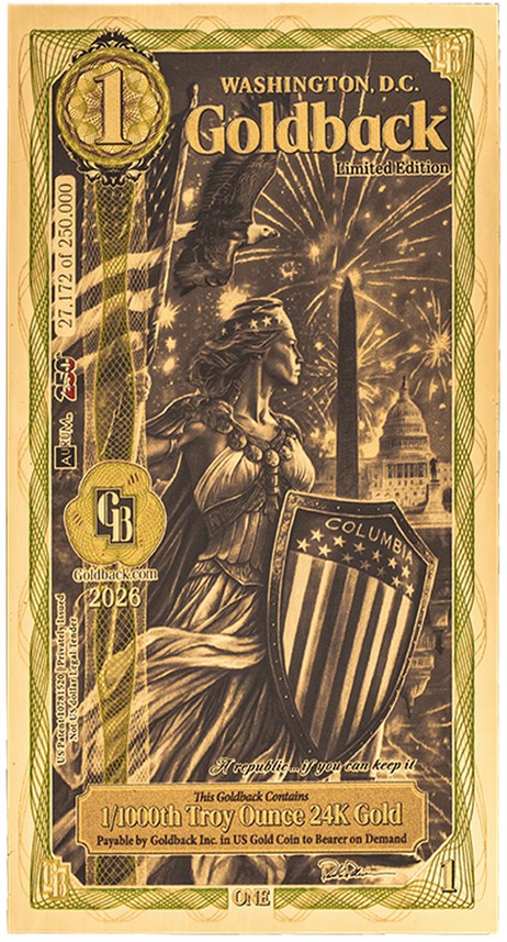2026 Washington D.C. Goldback is a special, one-time commemorative issue marking the 250th anniversary of the United States. Featuring the allegorical figure "Columbia," these voluntary, local currency notes contain (1/1000) troy oz of .9999 fine 24K gold, with advanced, updated, UV-reactive security features and a limited edition of only 250,000 minted