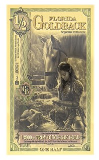 The product is a Florida 1/2 Goldback, a gold foil note with a fineness of 0.999. This unique bullion is minted in the United States by Goldback and is uncertified. It is a rare and collectible piece that represents a fraction of a troy ounce of gold, making it a valuable addition to any precious metal collection. Date varies, may be Alpha or non alpha.