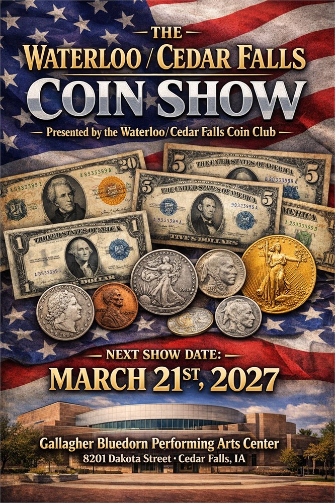 The 2027 Waterloo-Cedar Falls Coin Show is scheduled for Sunday, March 21st, 2027, featuring over 40 tables of US and world coins, currency, and tokens at the Gallagher Bluedoor Performing Arts Center on the UNI campus, Cedar Falls, IA. The event includes hourly prize drawings, free parking, and is hosted by the Waterloo-Cedar Falls Coin Club.