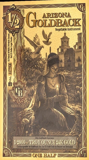 The product is a Arizona 1/2 Goldback, a gold foil note with a fineness of 0.999. This unique bullion is minted in the United States by Goldback and is uncertified. It is a rare and collectible piece that represents a fraction of a troy ounce of gold, making it a valuable addition to any precious metal collection. Date varies, may be Alpha or non alpha.