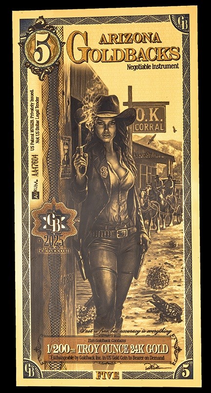 The product is a Arizona 5 Goldback, a gold foil note with a fineness of 0.999. This unique bullion is minted in the United States by Goldback and is uncertified. It is a rare and collectible piece that represents a fraction of a troy ounce of gold, making it a valuable addition to any precious metal collection. Date varies, may be Alpha or non alpha.