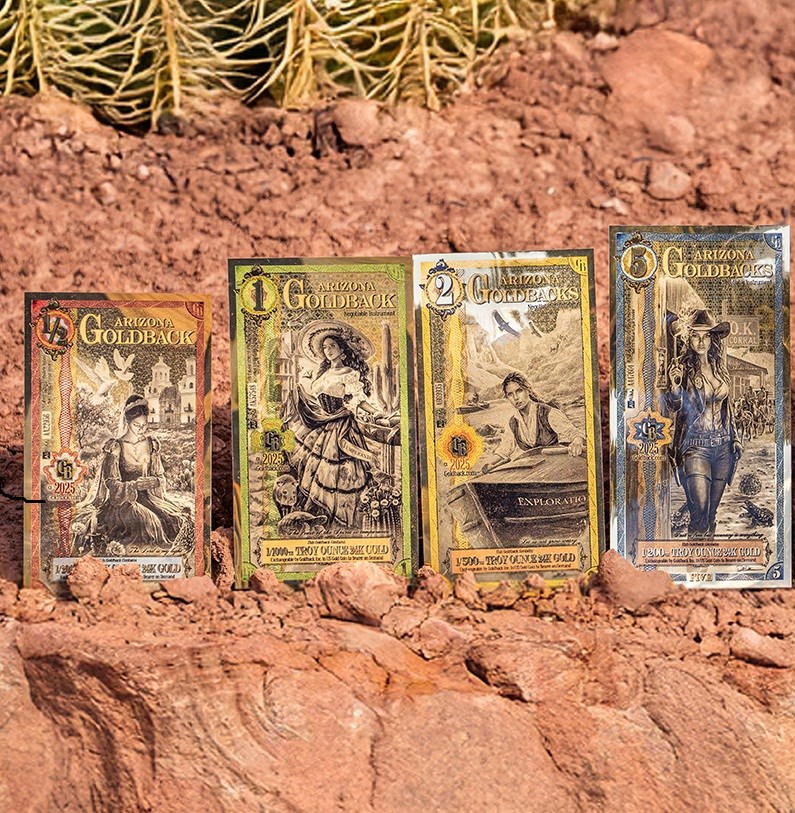 This exquisite collection features the lower denominations of Arizona Goldbacks, including the smaller denominations of 1/2, 1, 2, & 5 , gold foil notes with a fineness of 0.999. This unique bullion is minted in the United States by Goldback and is uncertified. It is a rare and collectible piece that represents a fraction of a troy ounce of gold, making it a valuable addition to any precious metal collection. Date varies, may be Alpha or non alpha.