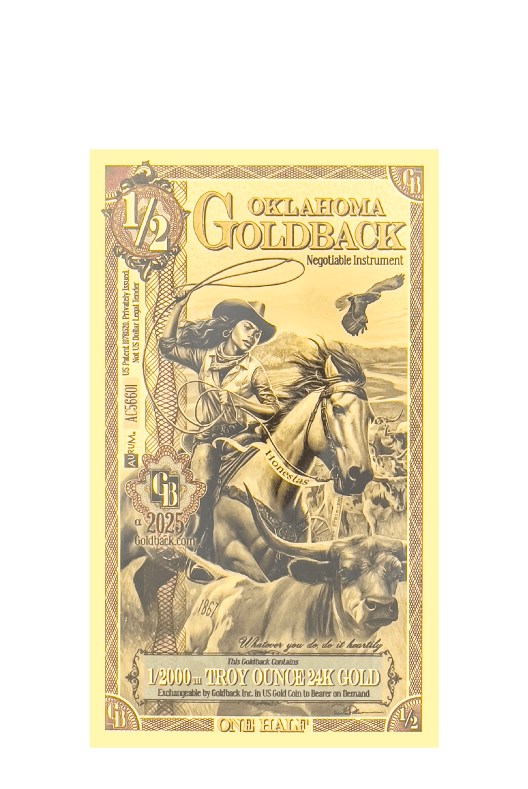 The product is a Oklahoma 1/2 Goldback, a gold foil note with a fineness of 0.999. This unique bullion is minted in the United States by Goldback and is uncertified. It is a rare and collectible piece that represents a fraction of a troy ounce of gold, making it a valuable addition to any precious metal collection. Date varies, may be Alpha or non alpha.