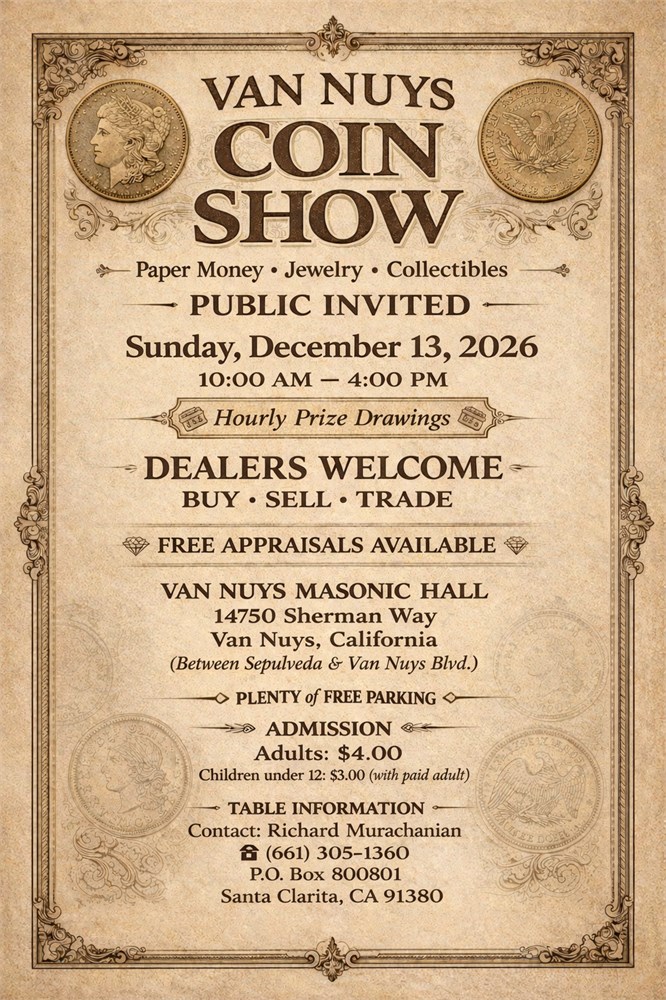 Van Nuys Coin Show - Sunday, December 13, 2026 View Watchlist >