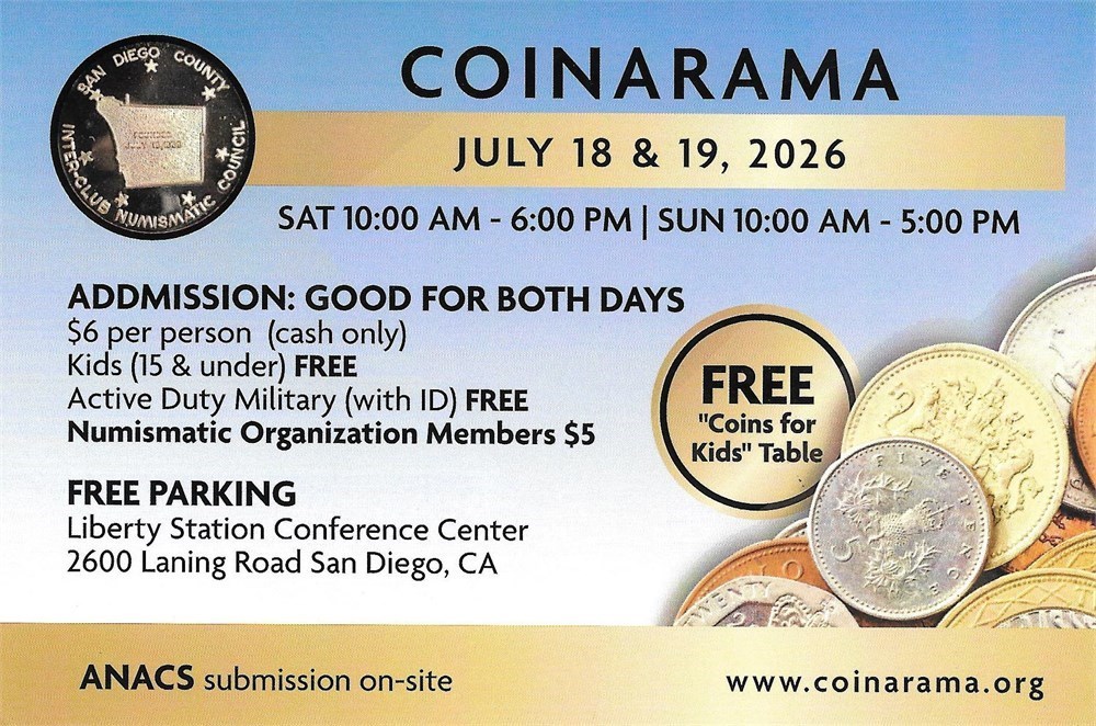 Sponsored by the San Diego Inter-Club Numismatic Council, our annual show will feature US and World coins, currency and exonumia. We will have over 65 tables with amazing items for collectors of all levels and all ages. There will be a "Coins for Kids" table with lots of fun stuff. We've got a great venue at the Liberty Station Conference Center and there's sure to be something to please everyone so bring the whole family. There will be a representative from ANACS for submissions and answer all your basic coin questions.