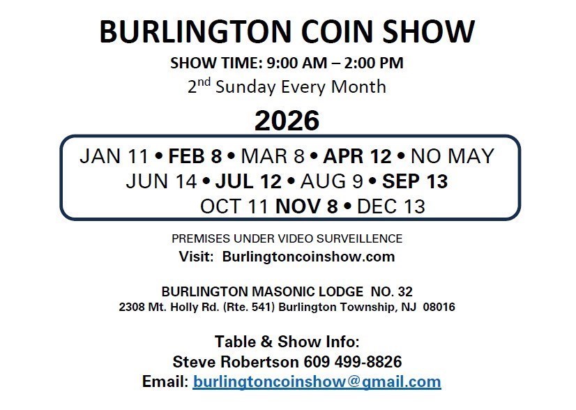 For additional information or questions about the show visit our website: burlingtoncoinshow.com or contact Steve (609)499-8826