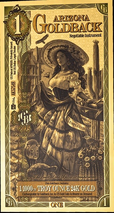 The product is a Arizona 1 Goldback, a gold foil note with a fineness of 0.999. This unique bullion is minted in the United States by Goldback and is uncertified. It is a rare and collectible piece that represents a fraction of a troy ounce of gold, making it a valuable addition to any precious metal collection. Date varies, may be Alpha or non alpha.