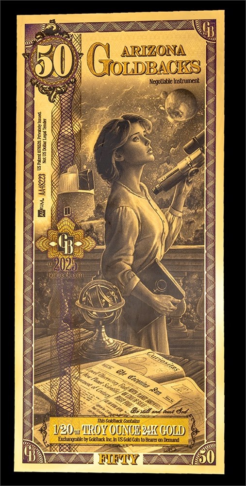 The product is a Arizona 50 Goldback, a gold foil note with a fineness of 0.999. This unique bullion is minted in the United States by Goldback and is uncertified. It is a rare and collectible piece that represents a fraction of a troy ounce of gold, making it a valuable addition to any precious metal collection. Date varies, may be Alpha or non alpha.