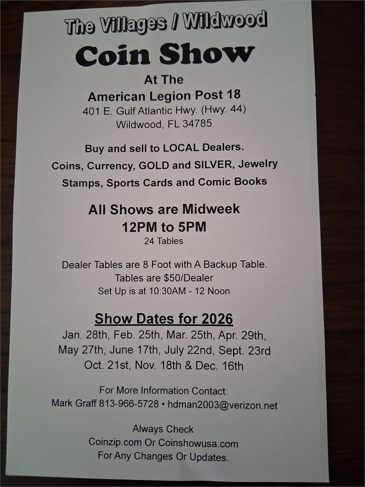 The Villages/Wildwood Coin Show - Our next show is on DECEMBER 16, 2026 in Wildwood, FL. This coin show will be held at the American Legion Post 18.