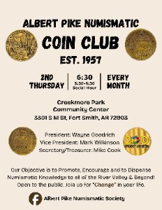 Our coin club was formed in 1957 and still going strong. We will be hosting a 40 table coin show at the Wyndham Hotel, downtown Ft. Smith July 17th and 18th. If you will be a dealer or just attending, you can get a discounted room rate at the Wyndham Hotel located at 700 Rogers Ave. Fort Smith, Ar. 72901. Phone: 479-783-1000 or Eamil: gkilgore@whyndamfortsmith.com. Please let them know you are with or attending the coin show to get discount.